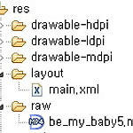 음악파일 위치 res -> raw -> main.xml main.xml package com.proandroid; import android.app.Activity; import android.content.res.AssetFileDescriptor; import android.media.MediaPlayer; import android.os.Bundle; import android.view.View; import android.view.View.OnClickListener; import android.widget.Button; public class SimpleAudio extends Activity { static final String AUDIO_PATH = "http://211.183.2.90/w..
