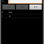 실행 화면입니다. db파일 생성 여부 확인방법은 DDMS 진입후 data > data > 자신의 패키지명 > databases > 파일 저장 해서 보려면은 바로 이 이미지 위에 디스켓 모양이 있는데 파일 선택후 그것을 클릭하면 됩니다. main.xml memo_row.xml DatabaseAdapter package kr.android.sqlite; import android.content.ContentValues; import android.content.Context; import android.database.Cursor; import android.database.SQLException; import android.database.sqlite.SQLiteDatabase; import android..