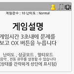 간단한 OX 퀴즈 게임입니다 최초 실행시 & 서버측 DB파일 과 저장되어 있는 DB파일 용량이 다를시에 웹에 접근하여 DB파일을 저장시킵니다 최초 인터페이스 입니다 위에 회색에 있는 아이콘이 현재 설정이 되어 있는 부분을 간략히 묘사되어 있습니다 (싱글모드,사운드 켜짐,진동켜짐,게임판수,난이도) 환경설정 값에 변경이 되어지면 메인에도 변경이 되어 집니다 환경설정 입니다 난이도 설정 입니다 어플리케이션 실행 아이콘 입니다 남은 게임수와 맞춘 문제가 간단히 나옵니다 간단히 Toast 메세지로 정답 오답이 나옵니다 모든 게임을 풀었을 경우 맞춘 문제가 나오면서 다시 최초의 메인화면으로 이동하게 됩니다 티스토어 http://www.tstore.co.kr/userpoc/game/viewProduct.omp?ins..